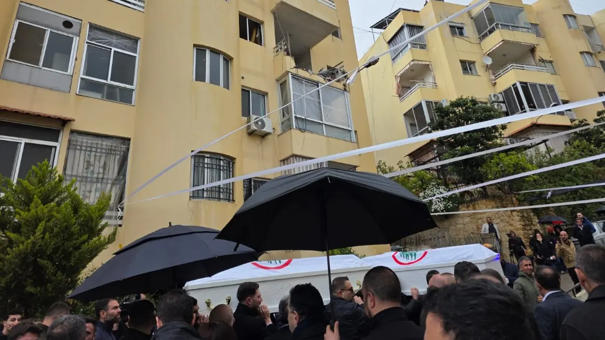 موكب جثماني بيار معوض وزوجته انطلق من ضهر الباشق إلى أمام منزلهما في عين سعادة في محطة وداعية ثم الى برج حمود قبل وصوله يحشوش